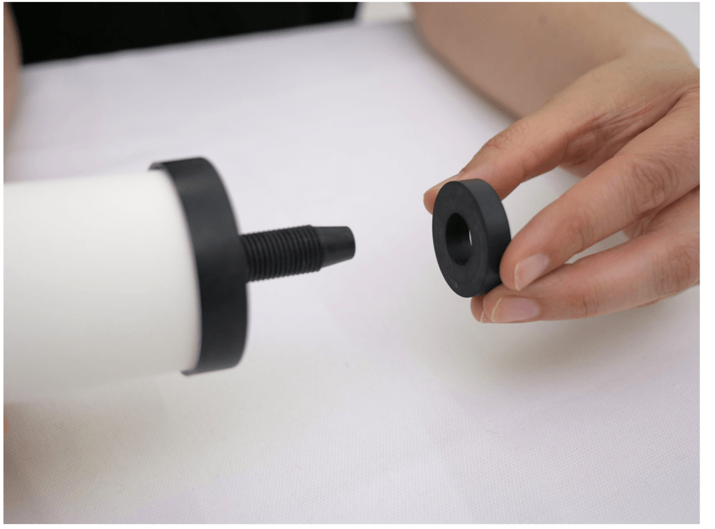 Place one rubber washer onto the threaded mount of the ceramic filter.